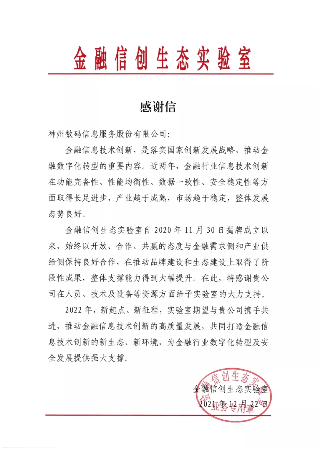 一封金融信创生态实验室的感谢信